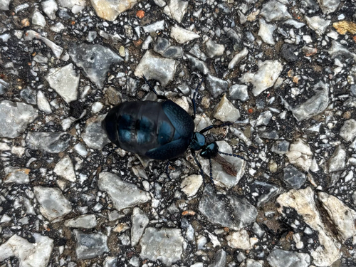 When we first moved to Triadi, there were amazing numbers of oil beetles, of at least two species (a blue-black and a green-violet). We had so many I didn’t need to search for them: I would find them climbing the wall of the house. Then the last two years: nothing. So I was very glad this year to spot one on the road:
